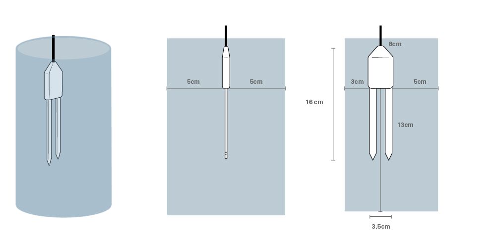 10HS使用和EC-5一樣的振蕩頻率(70MHZ),而且它的適用范圍更廣,同時(shí)在其它系統中使用也無(wú)需進(jìn)行特定校準。10HS電路板上的調壓器保證傳感器的激發(fā)電壓更廣(3-15VDC),且無(wú)需修改校準系數。傳感器的感應區域更大(1320 cm3),測定結果代表性更強。10HS推薦用于礦質(zhì)土的體積含水量測量。