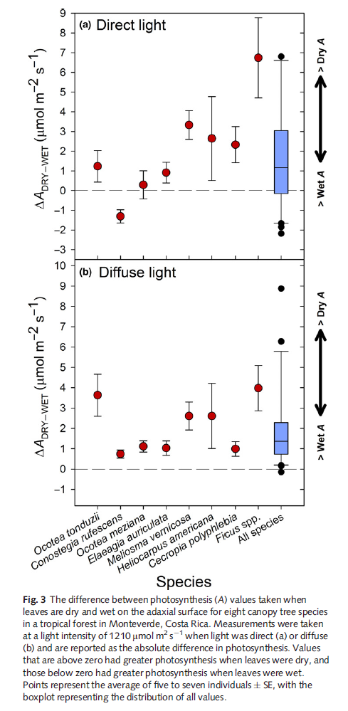 降雨讓葉片表面變濕,整體而言會(huì )降低葉片的光合速率。然而,不同樹(shù)種間的差異仍然很大。