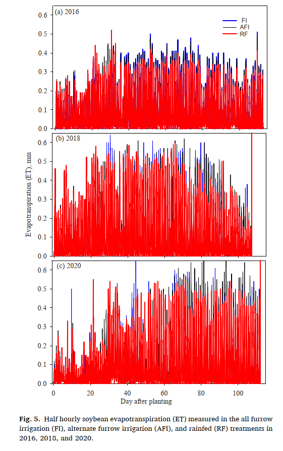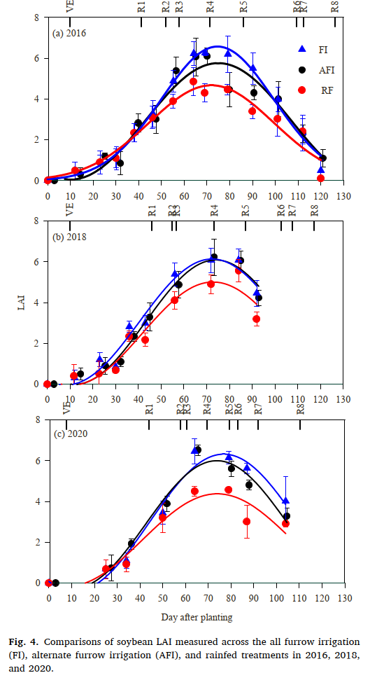 與FI和AFI相比,RF的葉面積指數也顯著(zhù)降低。三年中,與FI相比,AFI的大豆產(chǎn)量平均只下降了2%,而RF降低了24%。FI、AFI、RF的平均產(chǎn)量分別為4507、4413、3422 kg ha-1;季節性蒸散量分別為549、562、527mm;水分利用效率分別為8、8、7kg ha-1mm-1。