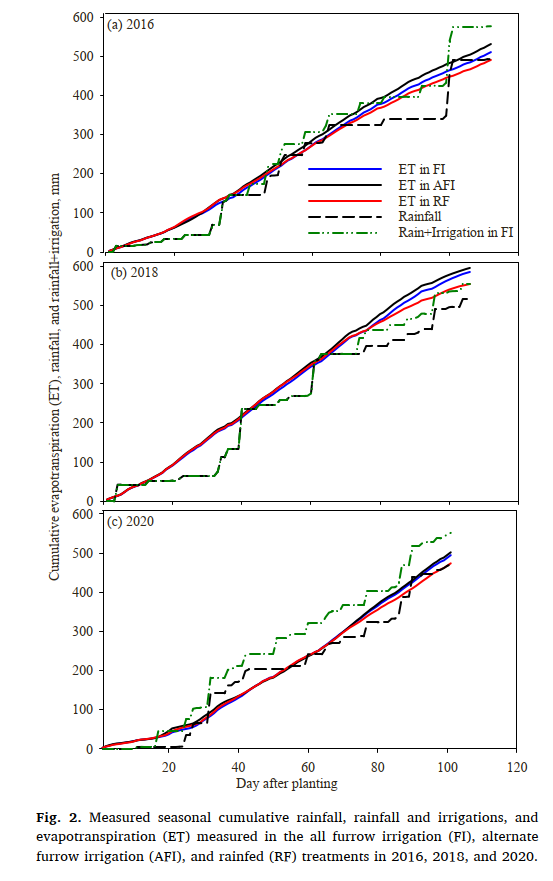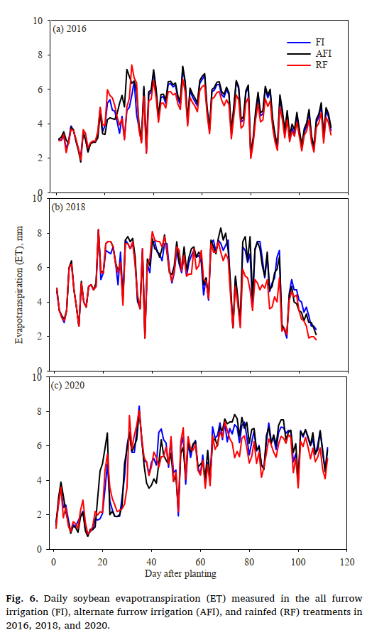 研究者們評估了全溝灌(FI)、間隔溝灌(AFI)和雨養(RF,不灌溉)對大豆產(chǎn)量和耗水量的影響。
