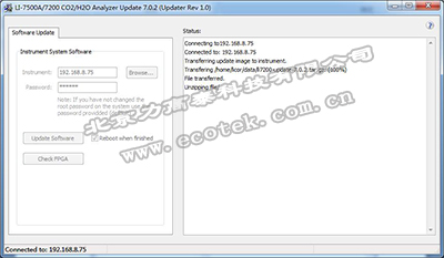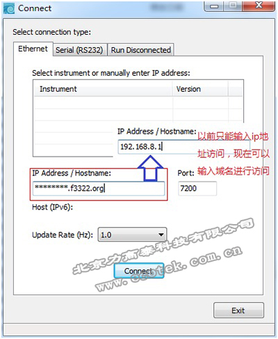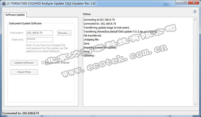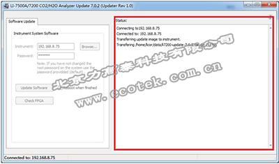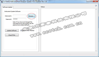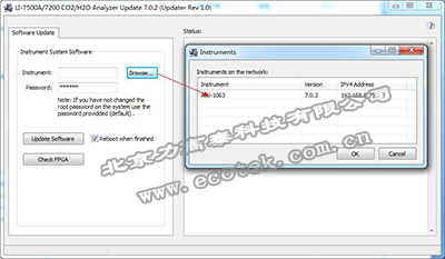 3、 解壓縮下載的升級固件文件,運行update7x00.exe文件,點(diǎn)擊Browse,選擇要升級的儀器建立連接,密碼使用默認即可。