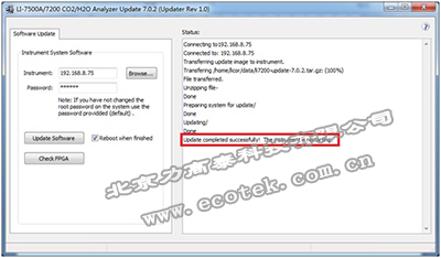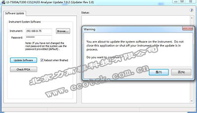 4、點(diǎn)擊Update Software,勾選后面的Reboot when finished,彈出警告界面,確認后軟件自動(dòng)開(kāi)始升級,右面Status處會(huì )顯示升級進(jìn)度和結果,升級完成后顯示successful,其間儀器會(huì )自動(dòng)重啟;