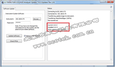 5、 升級成功,等待儀器重啟完成后,點(diǎn)擊Check FPGA,右面Status顯示目前儀器的FPGA版本和新固件FPGA版本,若版本信息不符,則需要進(jìn)行FPGA升級;