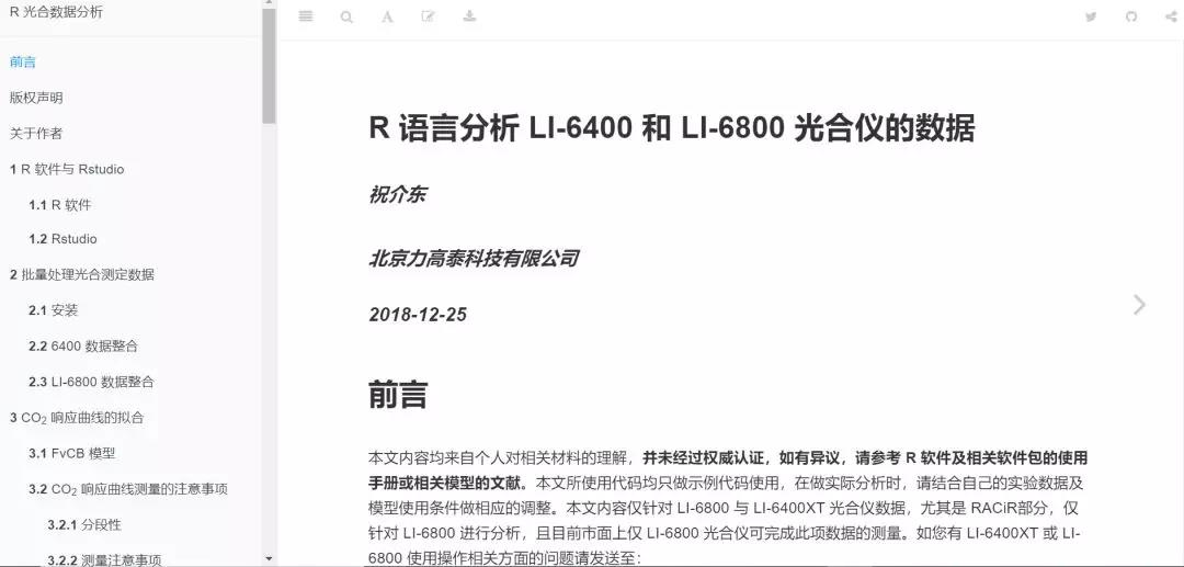用R分析LI-6400及LI-6800的數據,起源于我最初入職時(shí)LI-6400的學(xué)習筆記,其中一些構思和代碼的實(shí)現是出差時(shí)晚上寫(xiě)的。初稿完成之后,技術(shù)部同事進(jìn)行了測試并提供了反饋意見(jiàn)。為了更好的完善這些內容,我今年9月份將全部源碼上傳到了GitHub【1】。目前有兩個(gè)Followers,但尚未貢獻Requests,希望有志同道合的小伙伴們一起來(lái)完善這本書(shū)。