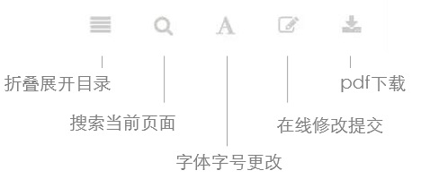 對于這種查看書(shū)籍的方式,我簡(jiǎn)單介紹一下。網(wǎng)頁(yè)上方從左到右的標記分別是 “折疊展開(kāi)目錄”,“搜索當前頁(yè)面”,“字體字號更改”,“在線(xiàn)修改提交”,“pdf下載”(如下圖)。