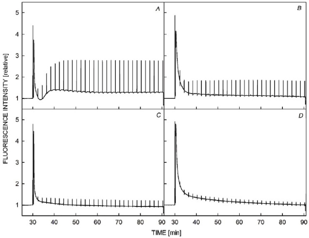 圖1是生長(cháng)在16°C環(huán)境下的菊苣熒光誘導曲線(xiàn),分別在16℃和2℃下測量、光強為100和800μmol m–2 s–1兩種。圖1A的測量溫度為16℃、測量光為100μmol m–2 s–1,因沒(méi)有溫度和光照的脅迫,可做為參考狀態(tài)。打開(kāi)活化光后,由于非光化學(xué)淬滅的產(chǎn)生,熒光信號迅速衰減?;罨?0分鐘后,植物達到了一個(gè)穩態(tài)。