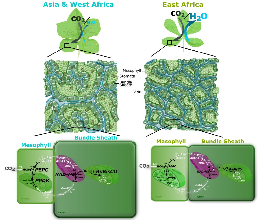 利用生物工程學(xué)的方法,使C3植物如水稻或小麥,具備C4植物的光合作用特征,可顯著(zhù)降低由光呼吸所造成的能量損失,進(jìn)而大幅提高作物產(chǎn)量。但是,要達到這一目標非常困難,因為C4途徑涉及生化、細胞生物學(xué)、葉片解剖結構等諸多方面。使用正向遺傳學(xué)[1]的研究方法,不太容易獲取以上方面的機制信息。因此,研究者們采用了另外一種研究方法。他們發(fā)現,白花菜(Gynandropsis gynandra)這種C4植物,在非洲和亞洲都有分布。由于所處的自然環(huán)境不同,其光合作用特征呈現出自然差異。研究者對不同地區的這個(gè)物種在維管束鞘大小、葉脈密度、氣體交換參數(使用LI-6800,LI-COR,Lincoln,NE)、碳同位素分餾、以及C4循環(huán)核心酶的表達豐度方面進(jìn)行了對比。