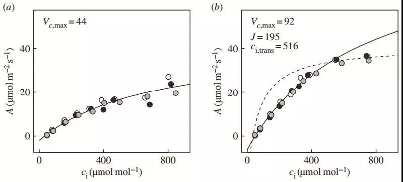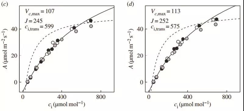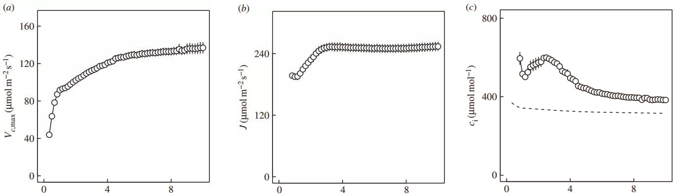 圖3. 從50 μmol/m2/s到1200μmol/m2/s的10 min光合誘導過(guò)程中,光合限制的變化情況。a. Rubisco酶限制Vcmax;b. 電子傳遞限制J;c. Vcmax和J兩種限制因素的拐點(diǎn)Ci。
