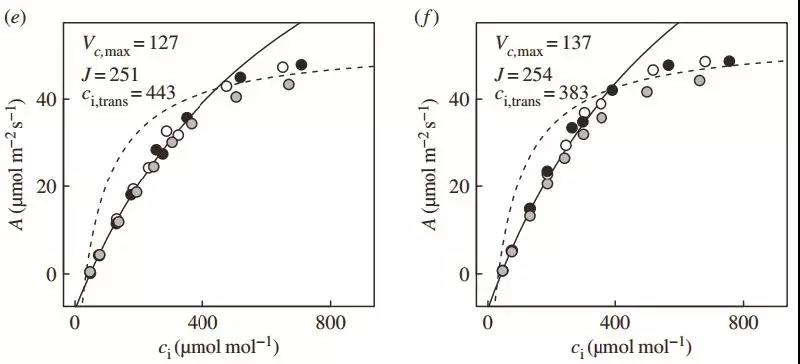 圖2 從50 μmol/m2/s到1200μmol/m2/s的光合誘導過(guò)程中的動(dòng)態(tài)A-Ci曲線(xiàn) :a. 20 s;b. 1min;c. 2.5 min;d. 3 min;e. 4.5 min;f. 10 min。在光合誘導后的前40 s,植物光合主要受限于A(yíng)c,Vcmax也顯著(zhù)低于穩態(tài)光合。隨著(zhù)誘導進(jìn)行,Vcmax和J均開(kāi)始升高,且J升高要快于Vcmax。