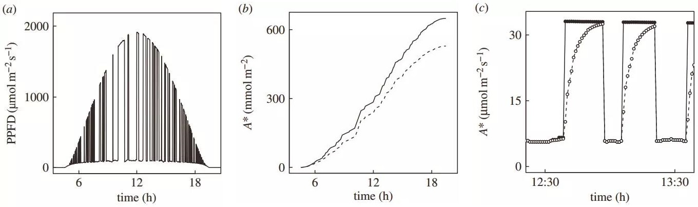 圖4 a. 模擬葉片表面在晴朗的一天中所接受到的PPFD變化;b. 根據光響應曲線(xiàn)估算的一天總光合CO2累積量A*(實(shí)線(xiàn)) VS 考慮光合誘導引起的Rubisco再活化后估算的一天總光合CO2累積量A*(虛線(xiàn));c. 正午時(shí)間段,無(wú)光合誘導滯后現象的光合速率(實(shí)心圓)和考慮Rubisco活化后的光合速率(空心圓)。