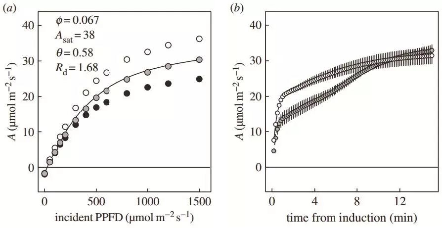 以下所有數據均出自Taylor SH, Long SP. 2017 Slow induction of photosynthesis on shade to sun transitions in wheat may cost at least 21% of productivity. Phil. Trans. R.Soc. B 372:20160543.