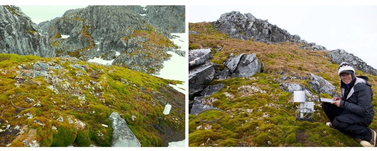 “我們發(fā)現了大約有100種苔蘚以及兩種維管束植物,南極發(fā)草和珍珠草(Antarctic hairgrass and Pearlwort)。”van Gestel說(shuō),“生產(chǎn)力最高的區域位于利奇菲爾德島(Litchfield Island),這是一個(gè)需要特殊許可才能進(jìn)入的保護區。生產(chǎn)力最低的區域距離冰川的邊緣只有幾米。雖然那里沒(méi)有可見(jiàn)的植物,但土壤中的微生物是可以進(jìn)行光合作用的。這些微生物是碳通量的重要貢獻者。”