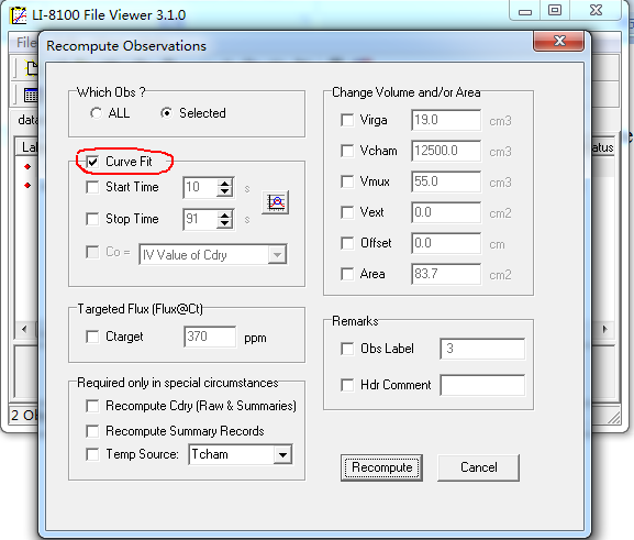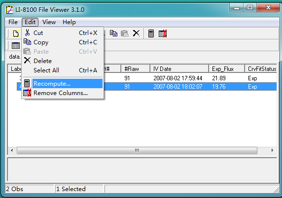 6、 在 FV8100 軟件中,打開(kāi)已修正 Tcham 的數據文件,選中進(jìn)行重計算的數據行,選 Edit > Recompute。 默認 Seclected,對選中行的數據進(jìn)行重計算;若對所有行的數據作重計算,則選擇 ALL。 |