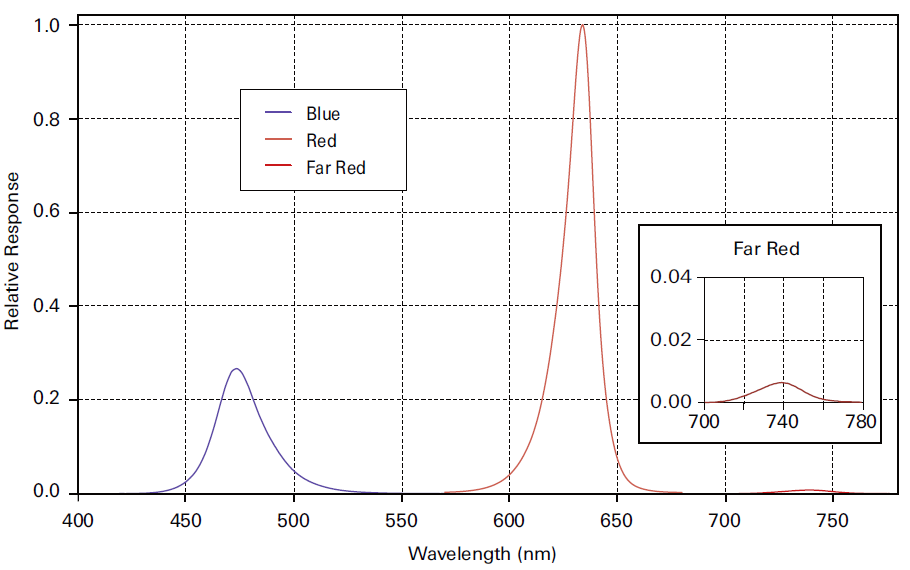 熒光葉室的紅、藍及遠紅光LED的典型光譜輸出